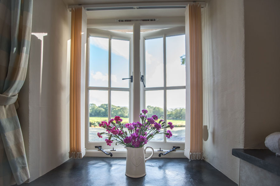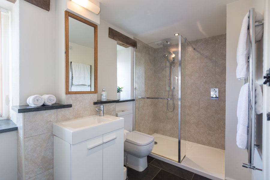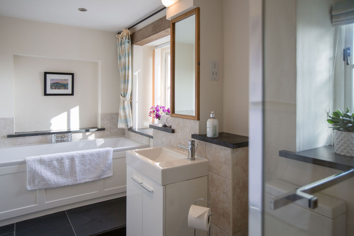 The bathroom is big and luxurious with a fabulous walk-in rainwater shower. Relax in the bath and take in the views of the meadow and hills.