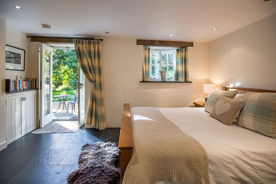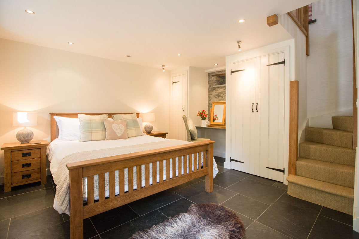 Downstairs, the bedroom is a wonderful calming space with a super-comfortable king-size bed, dressing-table and French doors out to the garden. Enjoy the underfloor heated slate floor throughout the ground floor.
